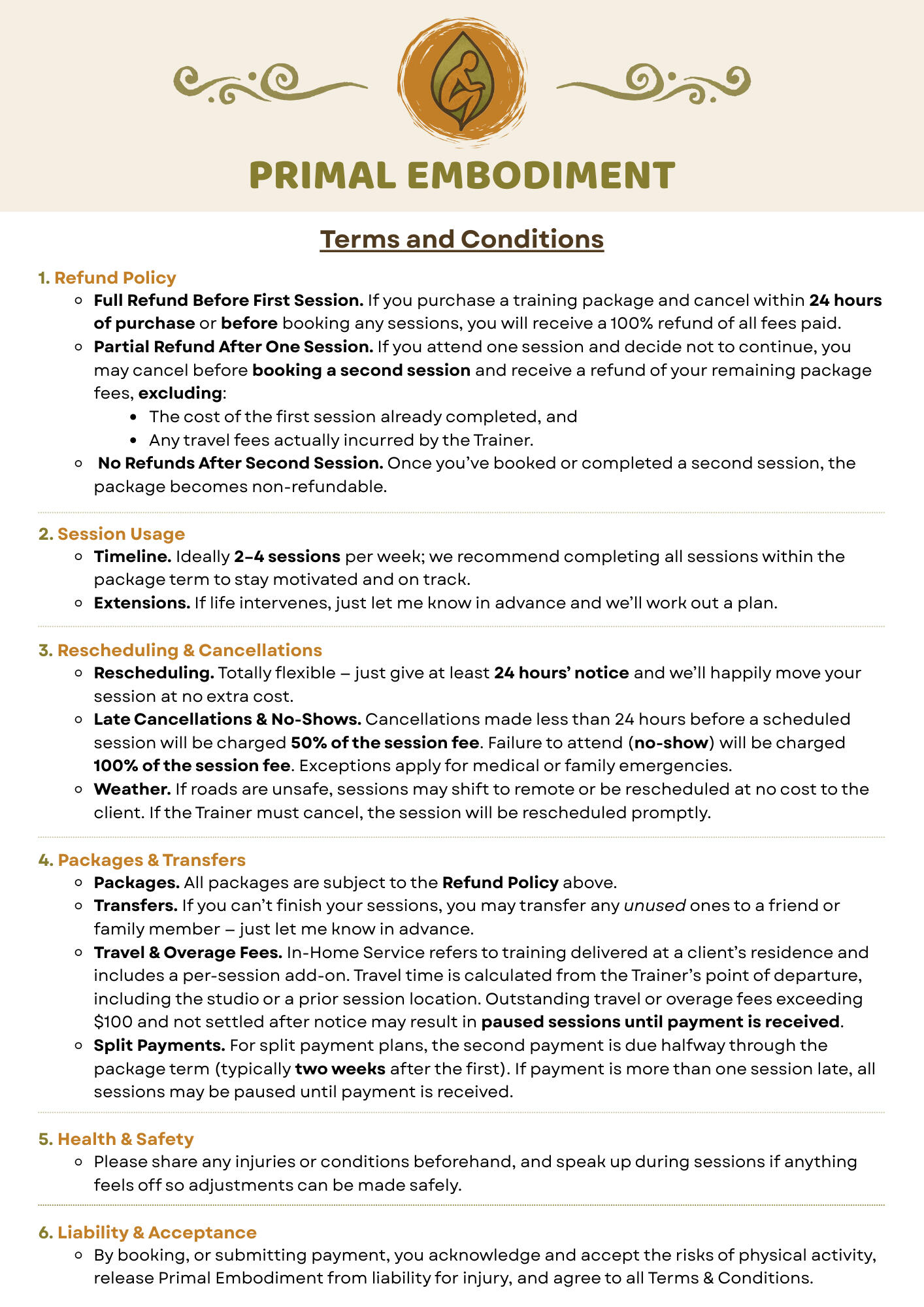 Last updated: January 13, 2026Primal Embodiment LLC (“Primal Embodiment,” “we,” “us,” or “our”) operates primal-embodiment.com (the “Website”).